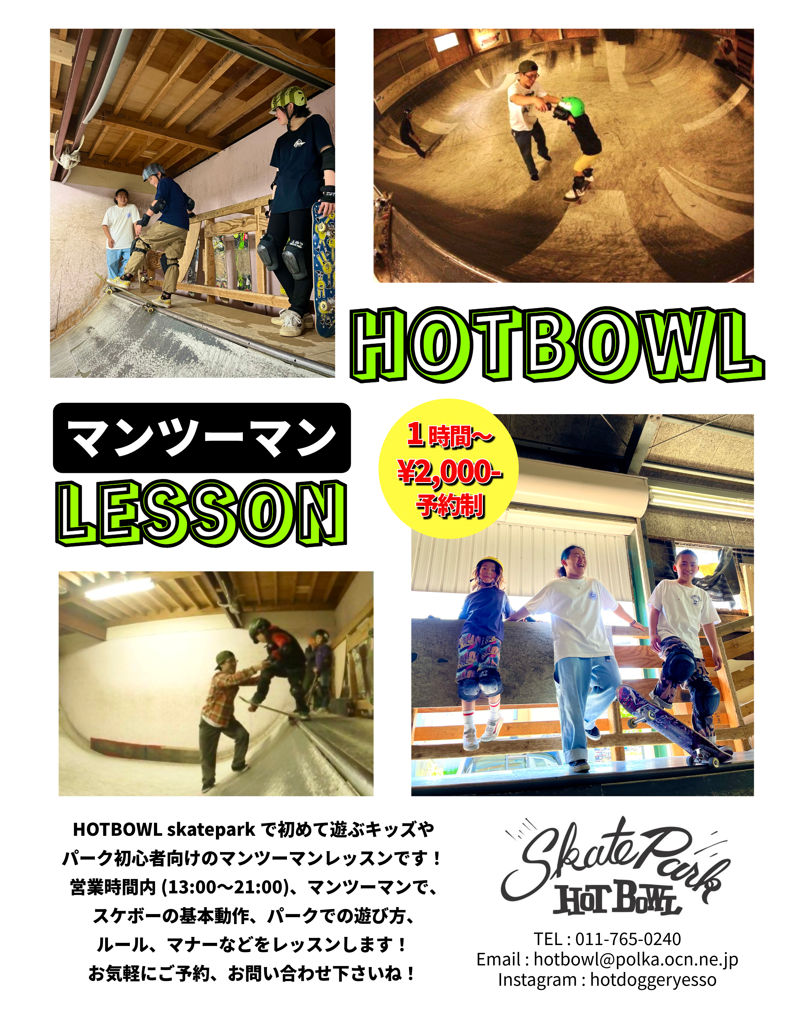 もっと読むHOTBOWL skateparkで初めて遊ぶキッズや、スケートパーク初心者向けのマンツーマンレッスンです。 レッスンコーチがつきっきりでパークの遊び方、ルール、マナー等をレッスンします。